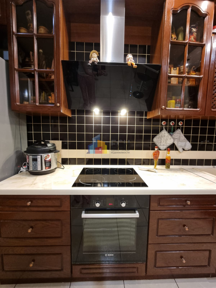 Кухня с фасадами из натурального дерева, индукционнная плита Zanussi, духовой шкаф Bosch, посудомоечная машина Bosch.