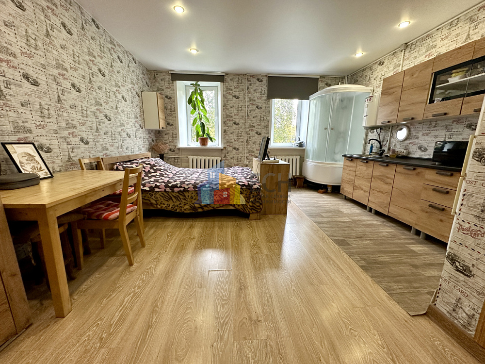 Продаём большую комнату со всеми коммуникациями, полностью переделанную в квартиру-студию со своими гардеробной, кухонной, душевой и спальной зонами. В квартире всего три комнаты, две из которых принадлежат доброй пожилой паре, которые в дачный сезон (с мая по октябрь) живут на даче. Единственное общее удобство – чистый туалет. Дом толстостенный (70 см) кирпичный. Окна выходят на тихий озелененный чистый двор. Котельная рядом с домом, топит очень хорошо! Комфортный средний этаж, квартира не угловая и не торцевая. Новая медная электропроводка с хорошим запасом мощности, рассчитанным и на весь свет с оборудованием, и бойлер, и на духовой шкаф, и стиральную машину, есть автоматы отключения. Свет в комнате удобно распределен по отдельным зонам и регулируется соответственно. Счетчик свой, все квитанции приходят свои на комнату. Все стеклопакеты заменены на качественные тройные, прекрасная тепло и шумоизоляция. Напольные покрытия ламинат. Комната полностью укомплектована всей необходимой мебелью и техникой. Дверь в комнату хорошая металлическая. В этом году был капитальный ремонт крыши, заменены окна в подъезде, планируется монтаж шлагбаума и на следующий год запланирован ремонт фасада дома. В шаговой доступности есть всё необходимое для комфортной жизни от образовательных учреждений, магазинов, супермаркетов и остановок транспорта до аптек, пунктов маркетплейсов, салонов различных услуг, спортивных учреждений и Кировского сквера. 5-7 минут от дома до центральной части города. Взрослый собстенник, прямая продажа, без обременений. Звоните, организуем показ в удобное время!