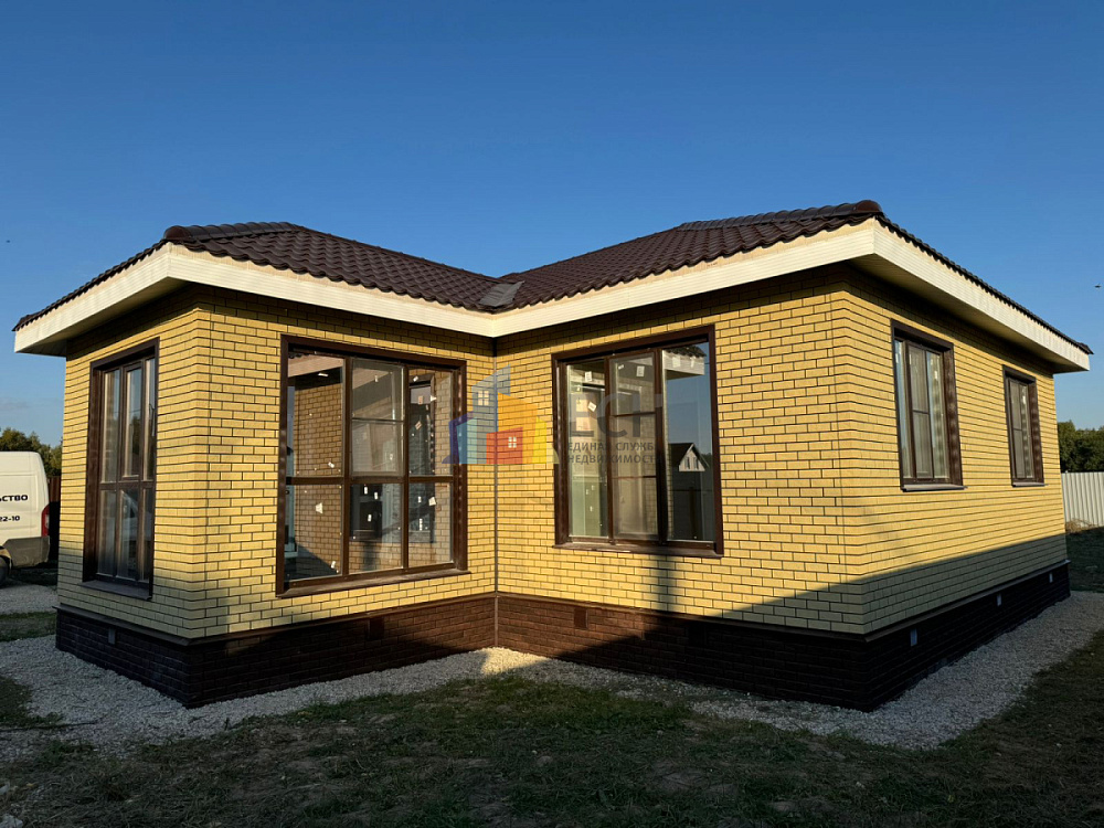 Дом на ленточном фундаменте из газобетона утепленный пенополистиролом с отделкой цокольным сайдингом.
