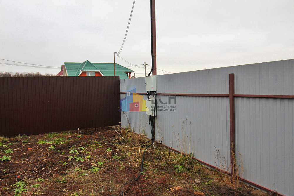 Участок ровный, правильной формы, огорожен забором с откатными воротами.